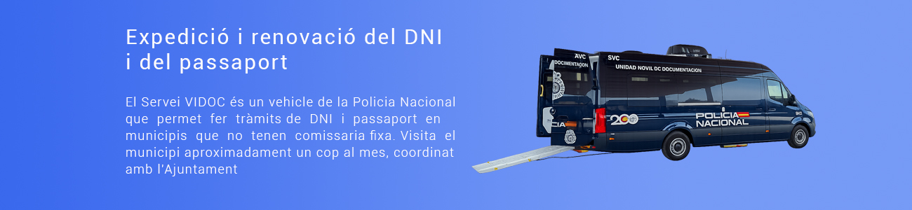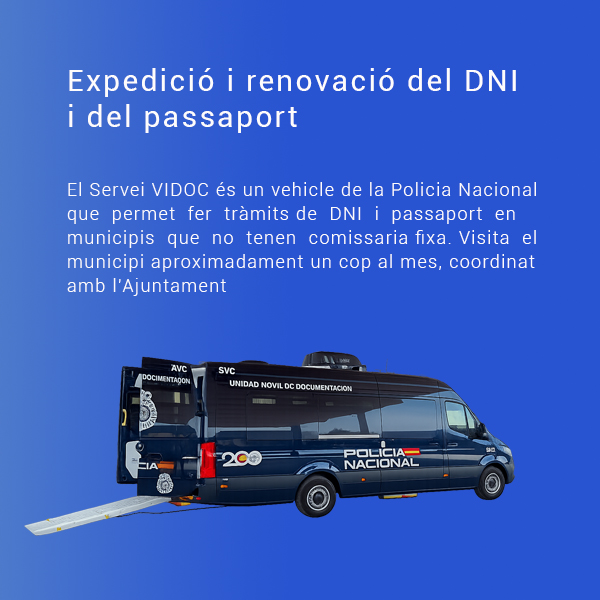 El Servei VIDOC és un vehicle de la Policia Nacional que permet fer tràmits de DNI i passaport en municipis que no tenen comissaria fixa. Visita el municipi aproximadament un cop al mes, coordinat amb l’Ajuntament