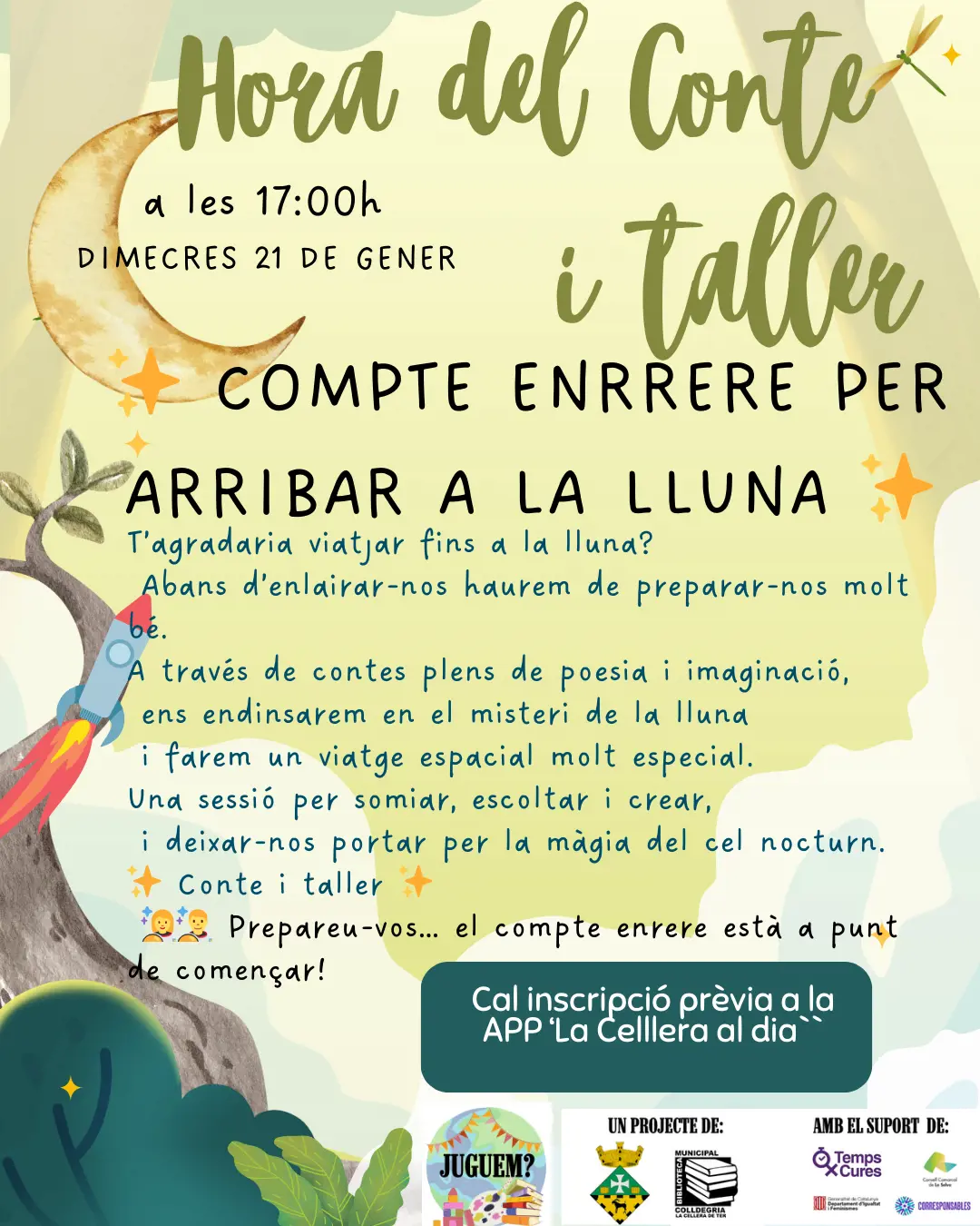 La Cellera de Ter » Càrrecs electes » Agenda » HORA DEL CONTE I TALLER: 🌙🚀 COMPTE ENRERE PER ARRIBAR A LA LLUNA! 🚀🌙